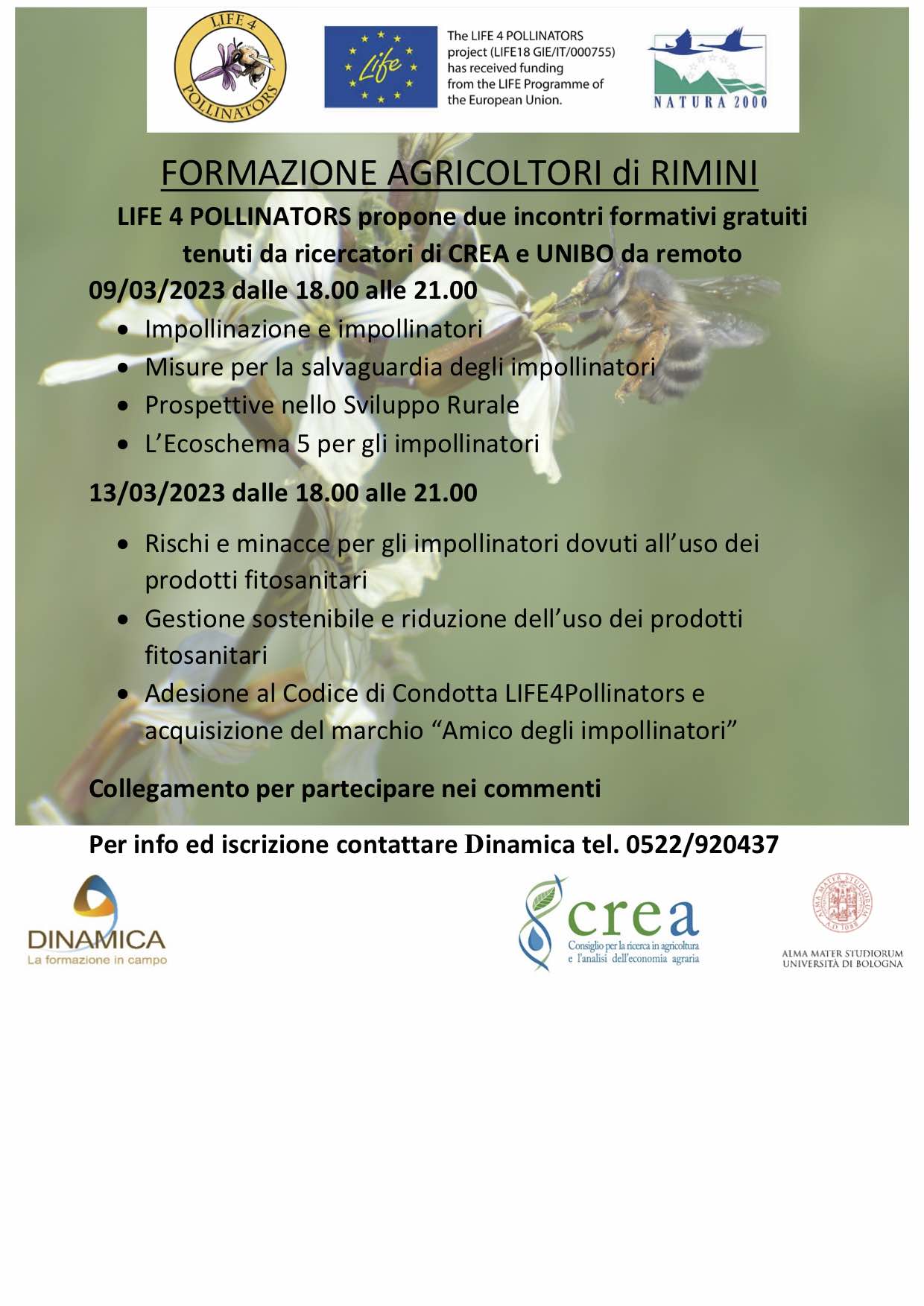 Il progetto europeo LIFE 4 POLLINATORS propone due incontri formativi gratuiti tenuti da ricercatori di CREA e UNIBO, sull’importanza e la valorizzazione del servizio di impollinazione nell’agroecosistema e la strategia europea.