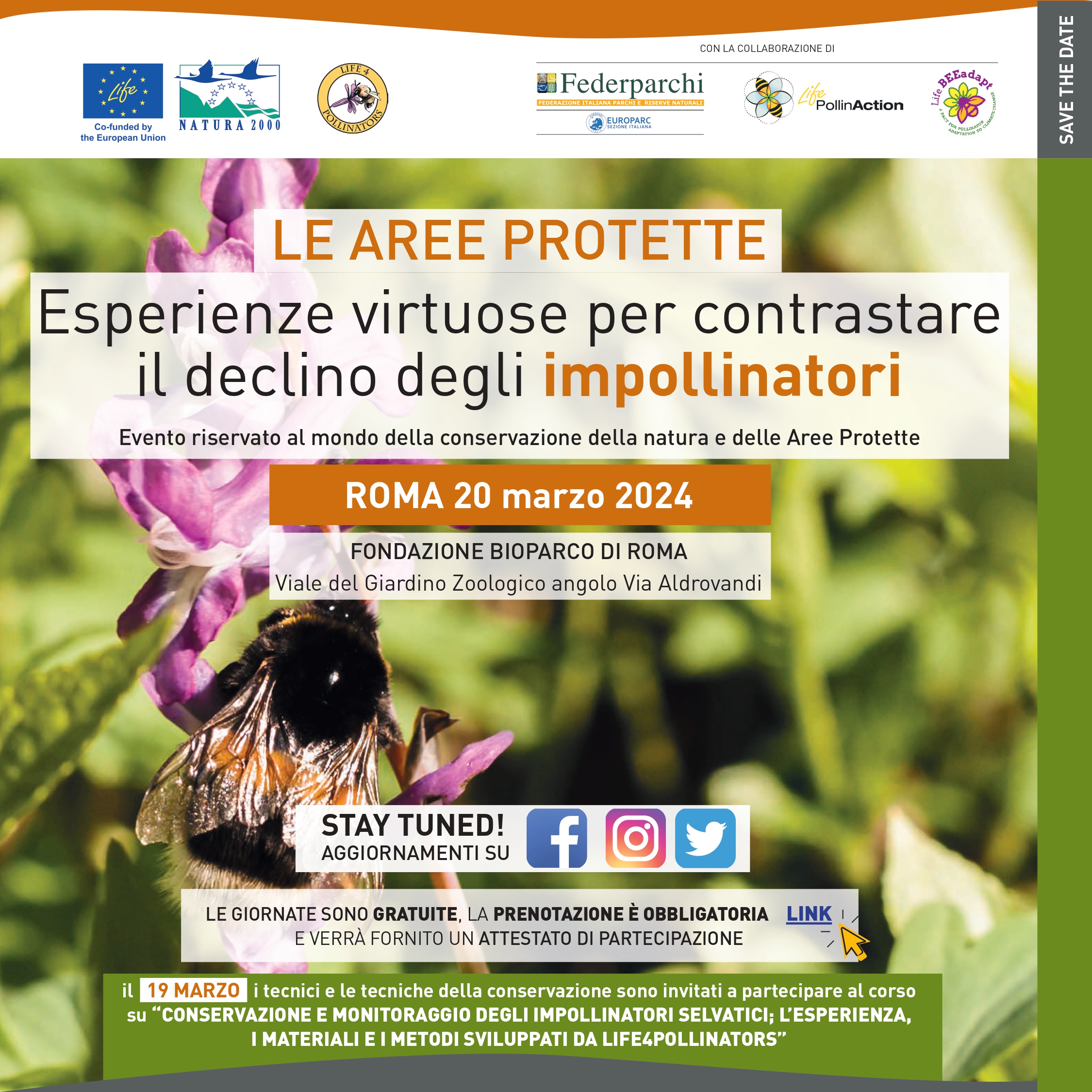 • un’attività di formazione gratuita il 19 marzo 2024, dalle 14:45 alle 18, a VILLA ADA - ROMA dal titolo “Conservazione e monitoraggio degli impollinatori selvatici: l'esperienza, i materiali e i metodi sviluppati da LIFE4Pollinators”